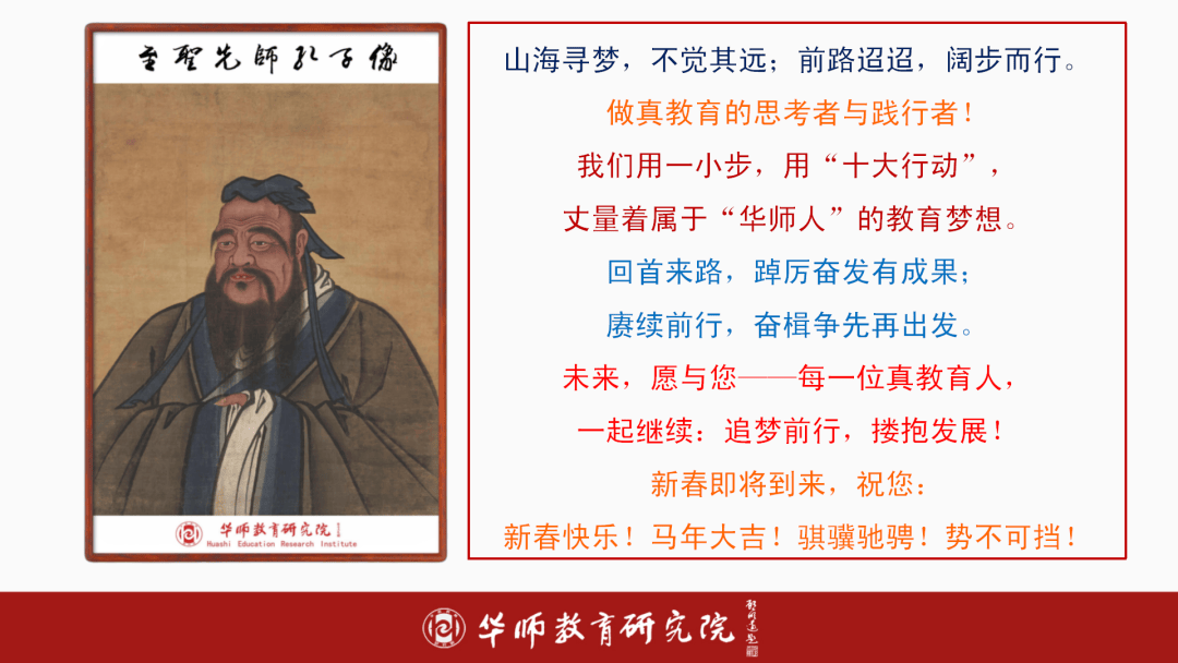 金蛇辞岁,力变化逐梦华夏;飞马送春,行大道成师。正在这万象更新的新春佳节即将到临之际,华师教育研究院怀着非常诚挚的表情,向每一位关怀、支撑我们的同仁,致以最强烈热闹的节日问候和最夸姣的新春祝愿!