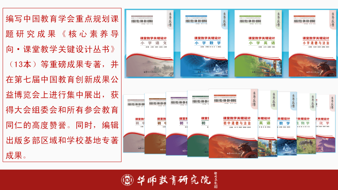 编写中国教育学会沉点规划课题研究《焦点素养导向·讲堂讲授环节设想丛书》(13本)等沉磅专著,并正在第七届中国教育立异公益博览会长进行集中展出,获得大会组委会和所有参会教育同仁的高度赞誉。同时,编纂出书多部区域和学校专著。