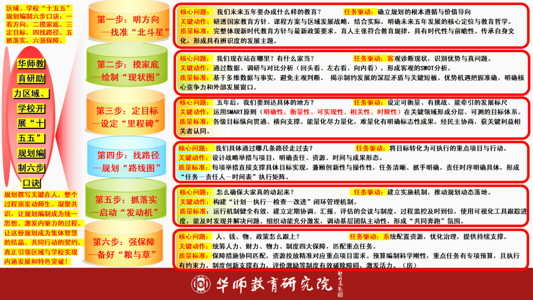 演讲提出华师教育研帮力区域、学校开展“十五五”规划编制“六步”,为教育变化供给实操指南。一是“明标的目的”,研透国度政策取课程尺度,确立成长定位;二是“摸家底”,通过SWOT阐发诊断校情学情,明白劣势短板;三是“定方针”,根据SMART准绳设定分层可测的育人方针;四是“找径”,规划课程立异、讲授变化等环节行动;五是“抓落实”,将方针为具体项目取步履;六是“强保障”,统筹人力、财力、轨制等资本支持。
