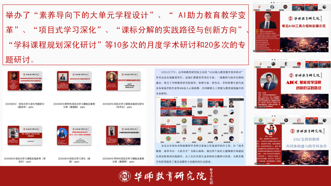 举办了“素养导向下的大单位学程设想”、“ AI帮力教育讲授变化”、“项目式进修深化”、“课标分化的实践径取立异标的目的”、“学科课程规划深化研讨”等10多次的月度学术研讨和20多次的专题研讨。