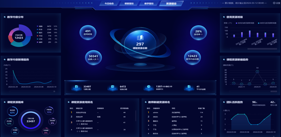 扶植数字资本平台,推进优良讲授资本共享。雨讲堂办事已笼盖全校师生讲堂讲授,五年来累计办事师生59131人、五年来累计活跃课程34577门,活跃学生28627人,活跃教师2141人;国度聪慧教育平台上线门,实现了讲授资本的无效集成取共享。